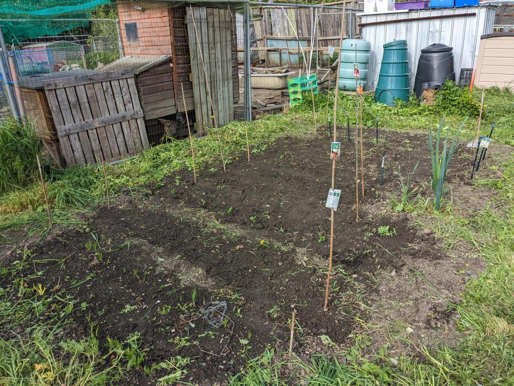 There’s more onions, leeks, broad beans, parsnip, carrots and a bunch of sunflowers that I kept standing on. Hopefully they’ll grow and not get eaten by things. Dropping tiny seeds into vast expanses of soil and hoping they grow before the weeds take over always seems quite a risky process.