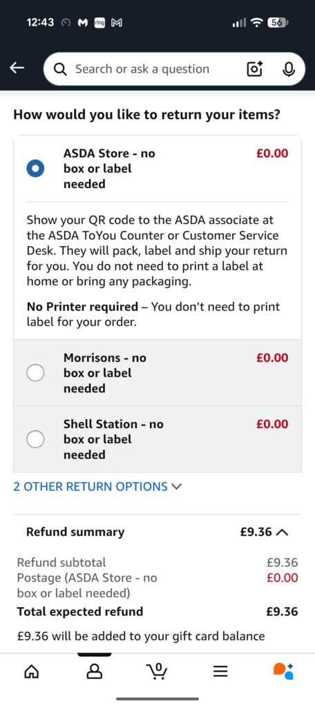 But if I’m being refunded more, well alright then. There’s a returns box in Morrisons, it’s quite good and must be a new thing. Last time I did a return it had to go to an Evri dropoff point.