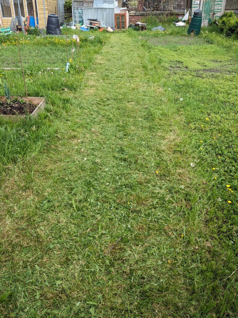 I’ve got a grass problem on my plot, the grass grows better than anything else. It’s a constant battle trying to keep the grass short and has so far caused the end of a petrol mower. I took my battery mower from home one weekend, but the batteries need charging half way through and I get the feeling the mower isn’t really designed for mowing such a large area. The batteries get quite hot.