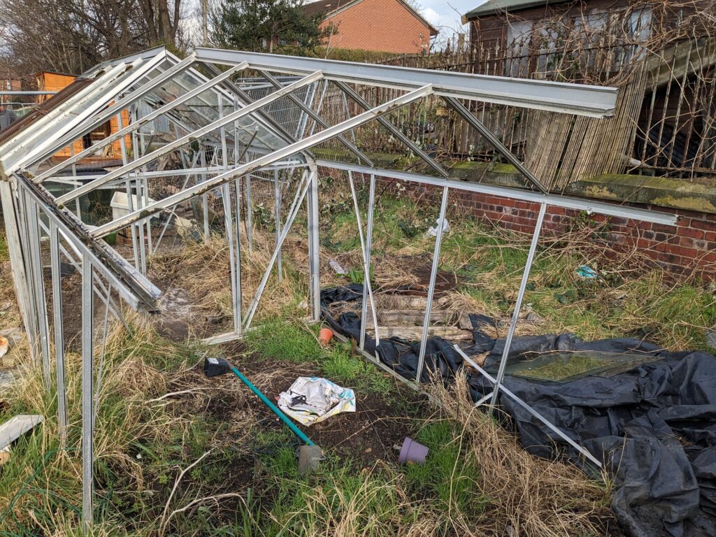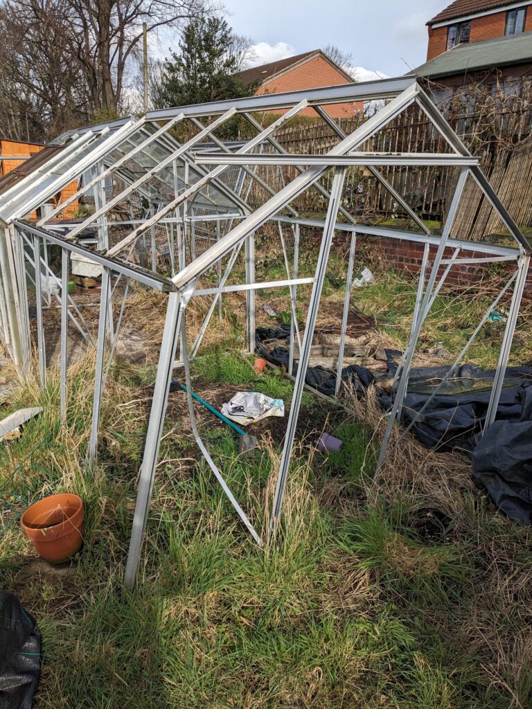 I did try to see if the greenhouse would just stand back up, it is made from bolted together aluminium after all. However some of it snapped and other bits twisted out of shape, which just shows how windy it was – a greenhouse with no windows managed to get blown so hard it snaped in places.