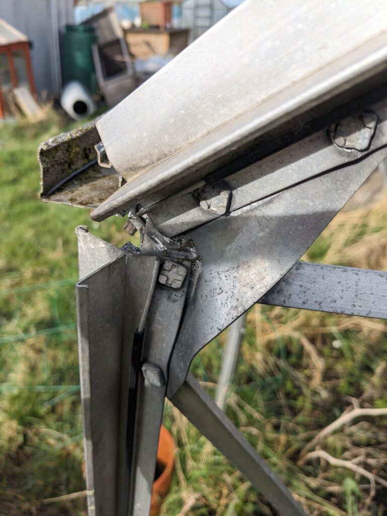 Intent on turning something kind of annoying into a positive situation I realised there was enough glass in both greenhouses to make one greenhouse be complete. This would save me quite a lot of money. I just needed to take the broken frame down. It’s been up quite a long time and came to me part assembled, and the aluminium bolts pushed into aluminium frames seem to have welded and corroded themselves together. It was not going to come apart easily.