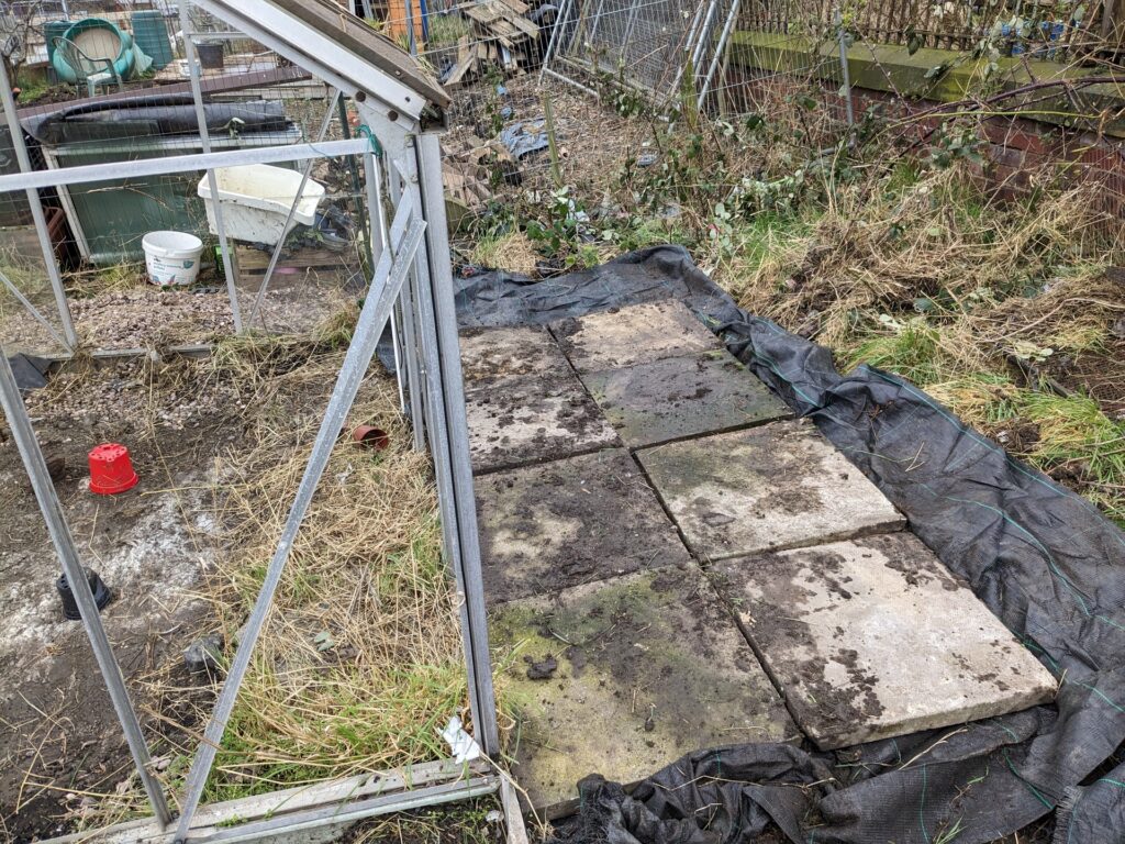 I put some weed matting down to try and keep the brambles at bay, and then moved eight pretty heavy paving slabs from elsewhere on the plot to make a base for the shed.