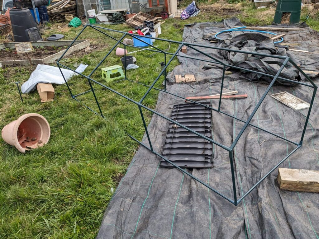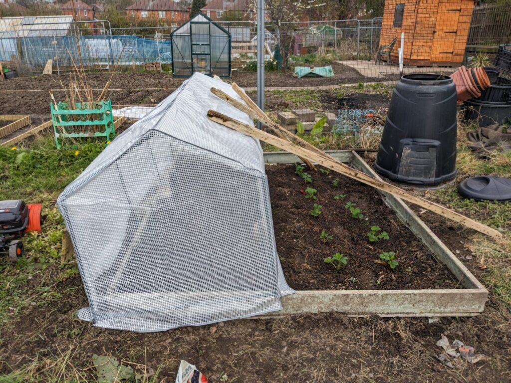 The final stage was to set up a small plant cover I’d bought off Amazon. It’s one of those kits made from the tubular metal and plastic connectors that tends to last a season at best before something fails or the wind takes it away. I’ve tried to buy a more robust one so maybe it’ll last all year if I’m careful?