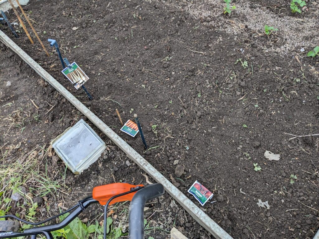 The second photo is for my reference too. There’s two rows of beetroot, two rows of carrots and then several rows of parsnip. The ground had a really good chewing with the rotavator and now actually resembles something you could grow plants in, rather than a field that’s had the grass ripped out.