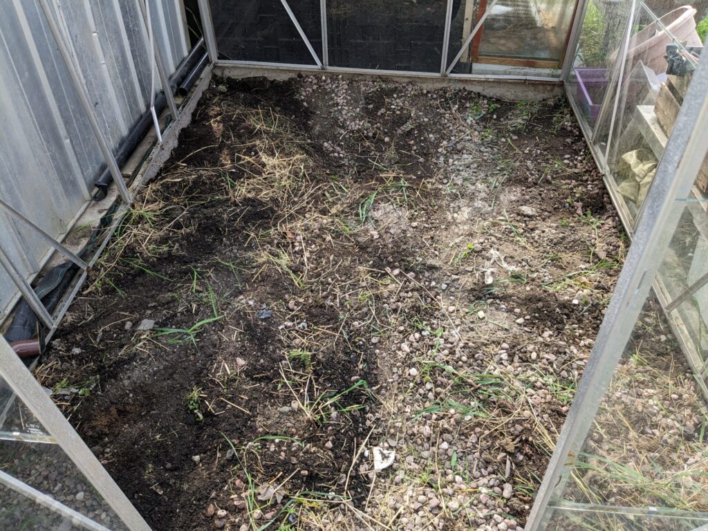 The greenhouse now stinks a bit, so I will leave the manure to rot down a bit more. I’ve dug it into the soil so hopefully the worms and things will get at it too. This is a before photo, I didn’t think to take an after one.