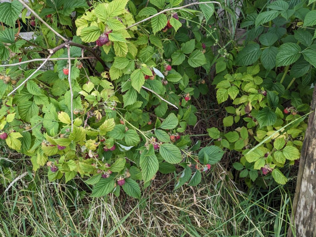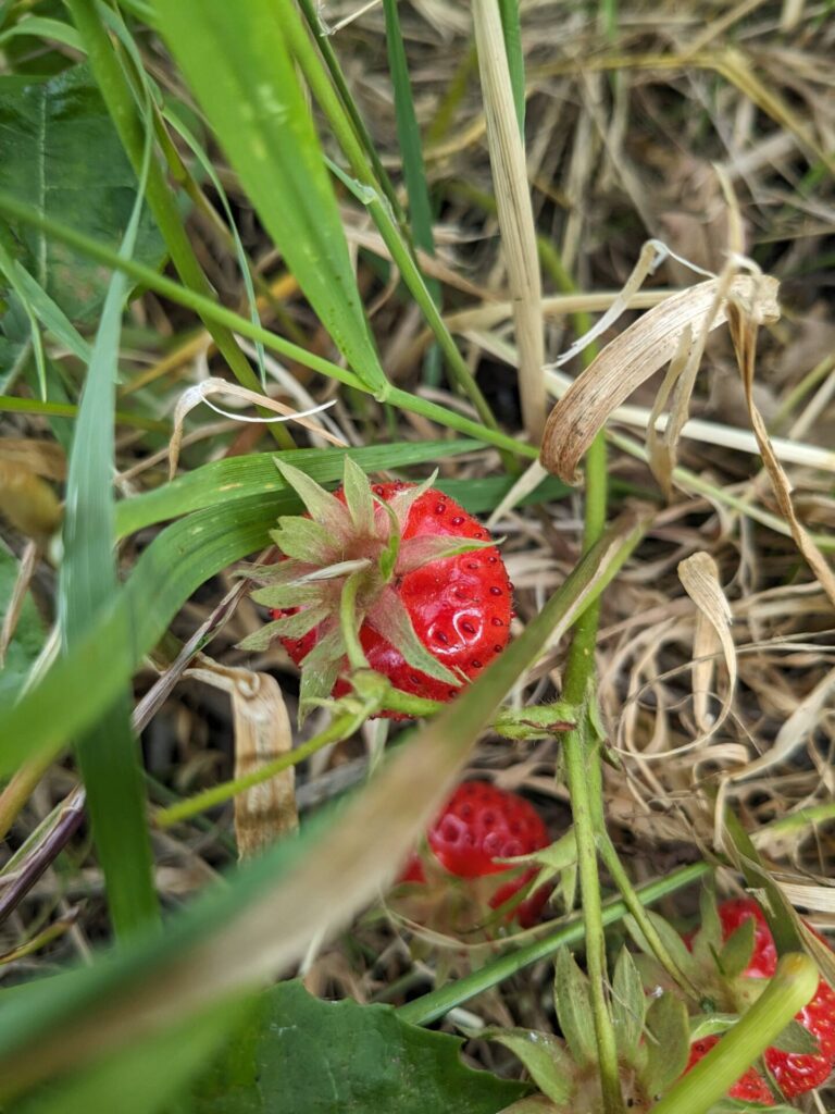 Some of the fruit bushes are having a go at making fruit, but it’s that dry malformed stuff you get when the weather is too hot. A few strawberries appear to have survived the mower too!