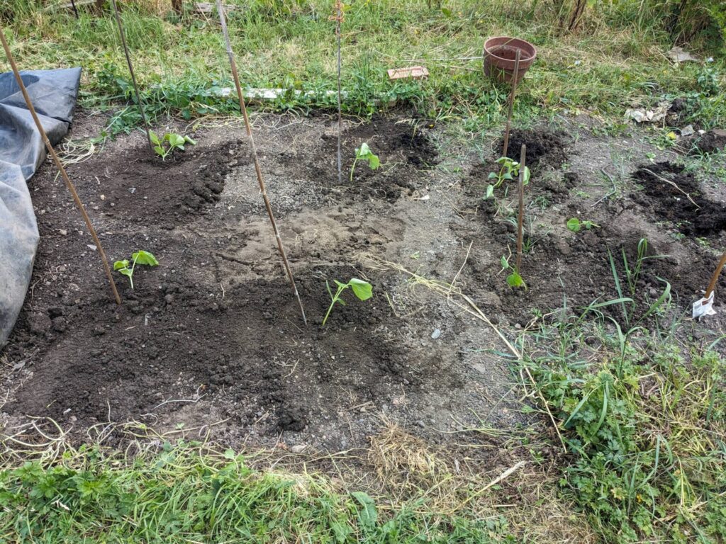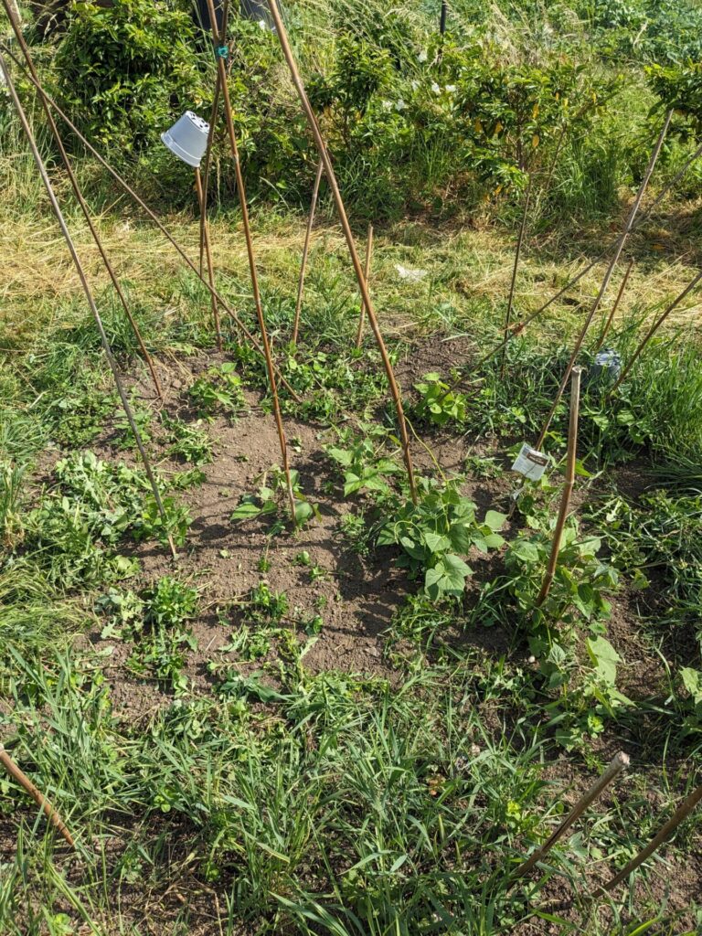 In one of the main areas various things are growing. The beans are a bit stunted, I grew them from last year’s crop so maybe they’re not a good strain or something. I have a feeling all the ground needs more nutrients in it too.